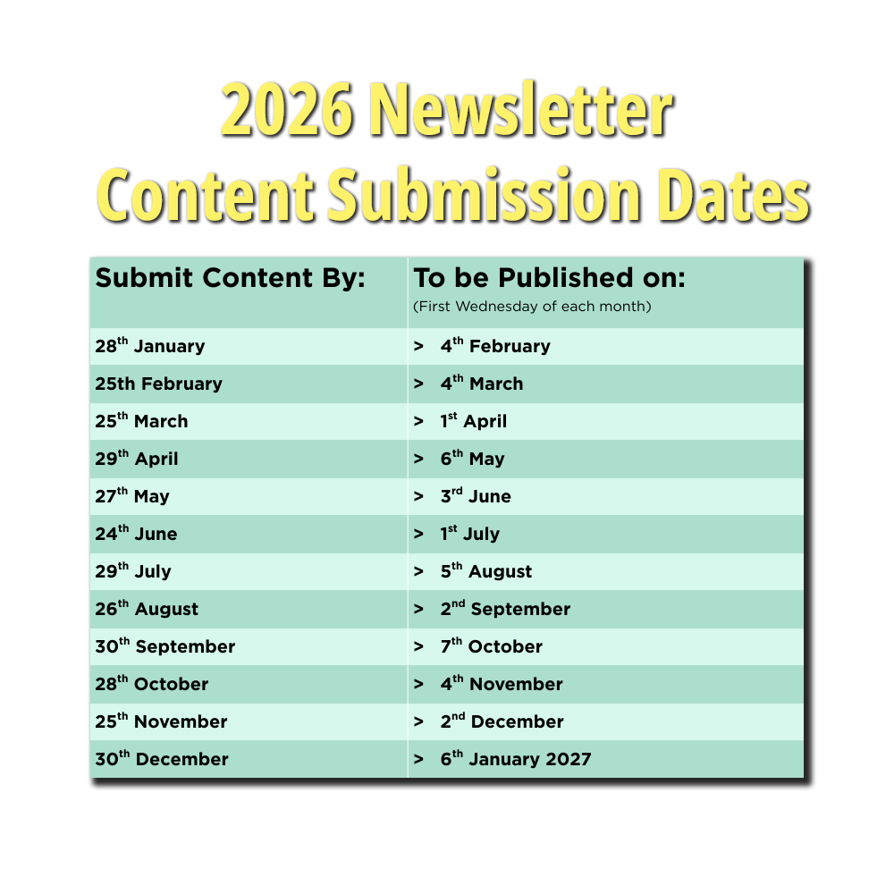 For items to appear in our monthly newsletter (Sent first Wednesday of every month), we need to have enough notice. Please see our infographic for 2026 Newsletter deadlines.